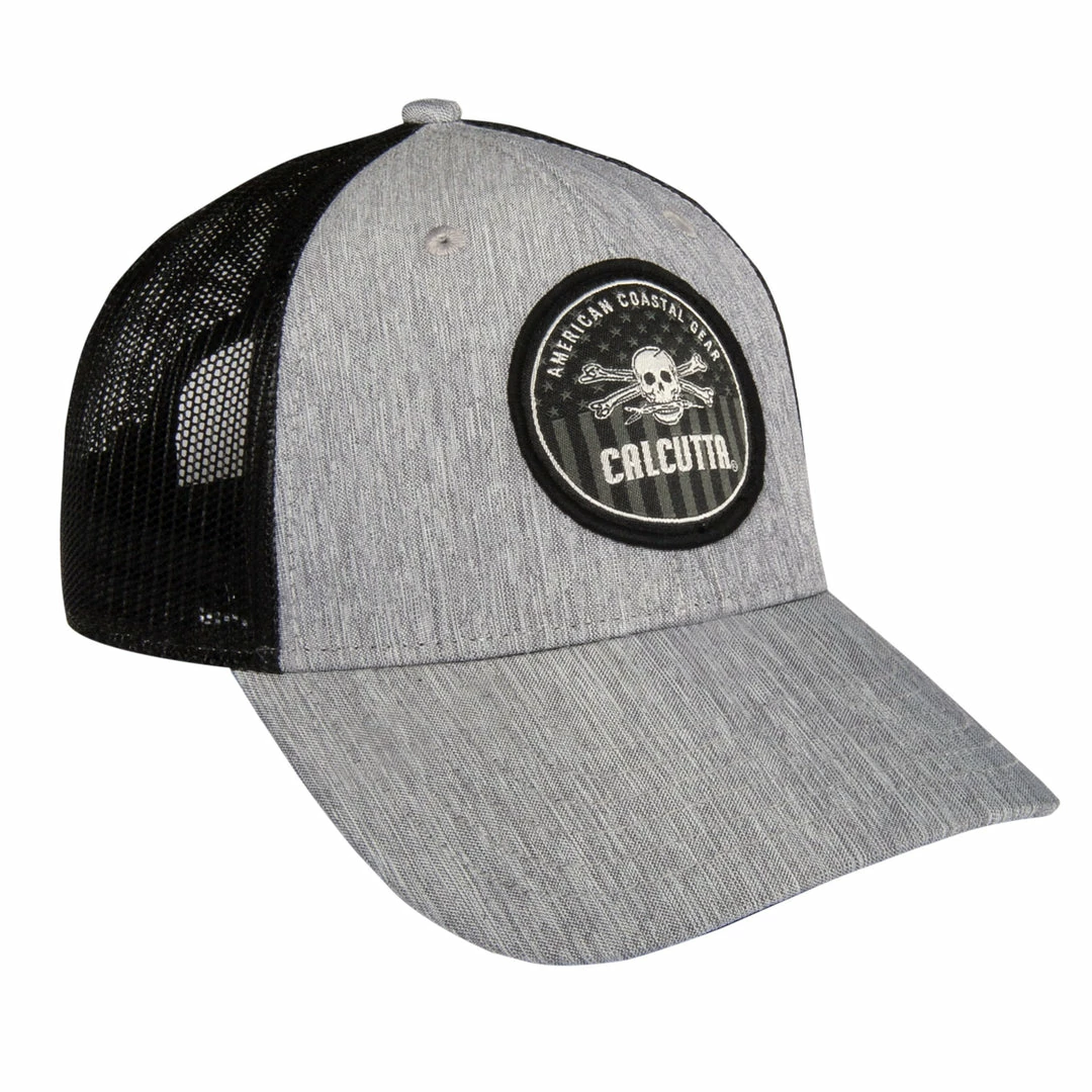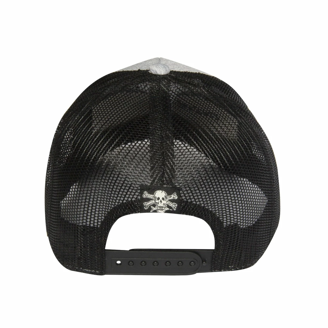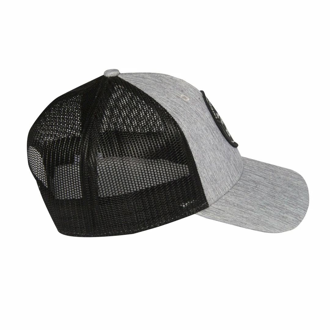 Six panel mesh cap with heather gray crown and brim, black under brim and black mesh. Woven artwork with stars and stripes and classic logo up front and adjustable snap back closure.