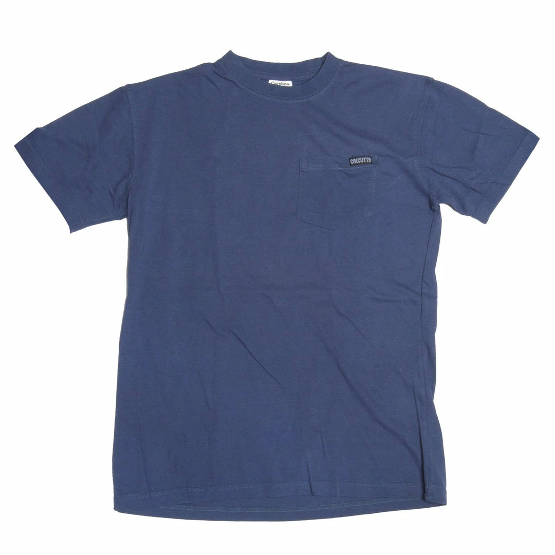 China Blue Ringspun Enzyme Washed T-shirt with Original Logo Flag design on back. Pocket front on all sizes except small.