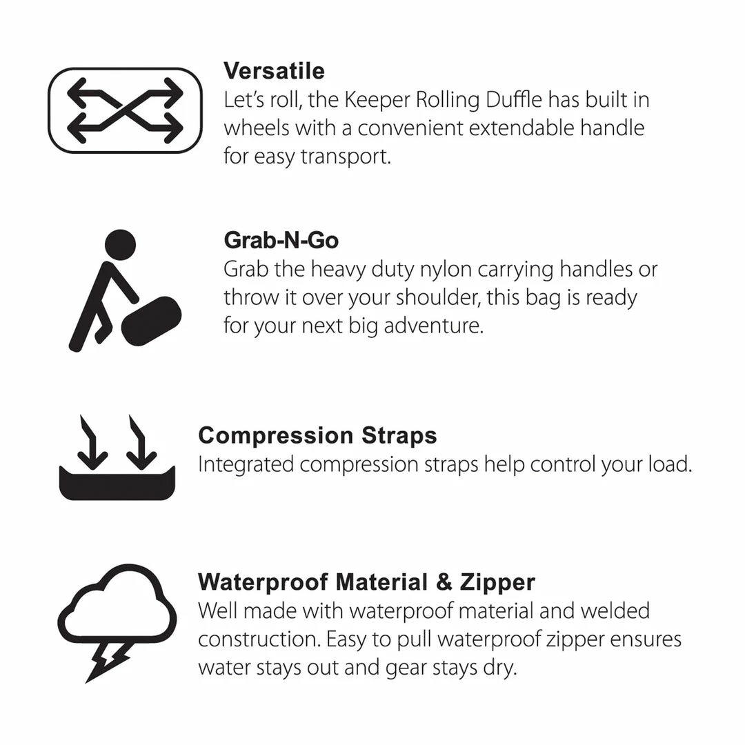 The Keeper Waterproof 82 Wheeled Duffel is the largest bag in our adventure travel series with a capacity of 82 Liters. This duffel bag is completely waterproof and is constructed with durable TPU material. The large wheels deliver superior performance and the included shoulder strap and padded handles offer you an alternative when rolling isn’t an option.