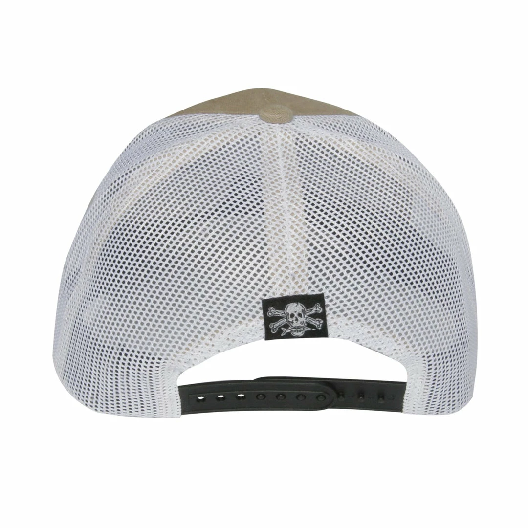 Known for our hard working coastal gear this hat is no exception. Six panel mesh cap with khaki crown and brim, black under brim and white mesh. Woven patch up front and adjustable snap back closure.