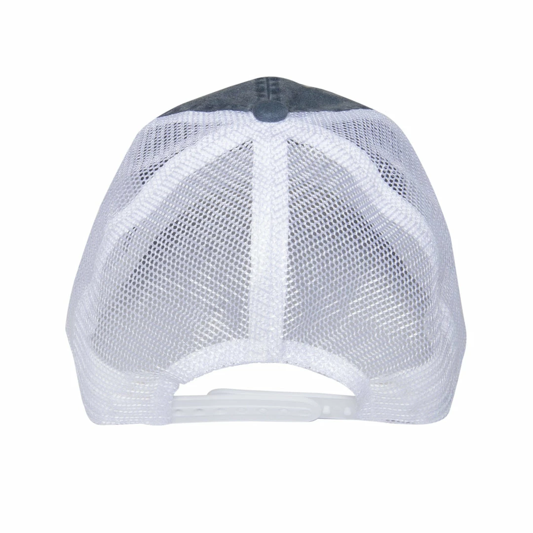 Woman’s six panel mesh cap with blue crown and brim and white mesh. Woven artwork with metallic thread up front and adjustable snap back closure.