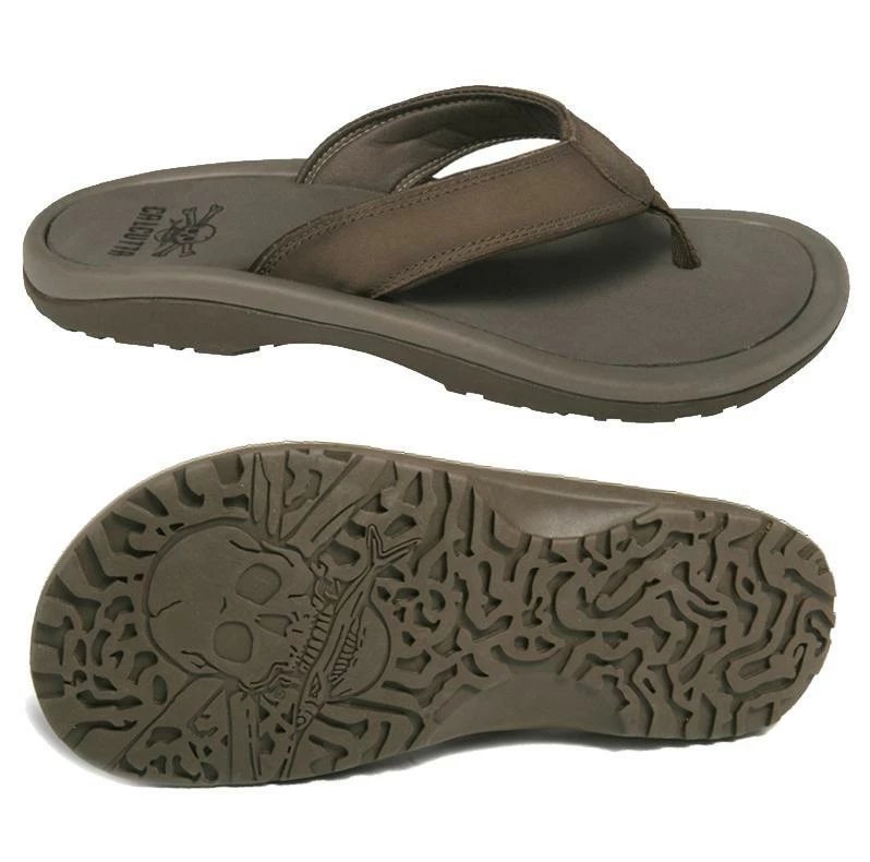 The Calcutta Squall flip flops features a non-marking outsole with a custom tread design featuring the iconic Calcutta skull and crossbones. The design of the custom sole helps channel water to the outside for superior traction on slippery surfaces. The Squall has a molded EVA midsole and a drop-in super soft footbed with raised arch. The uppers are made from action leather with a quick dry jersey lining and a Calcutta logo on the toe yoke. Available in whole sizes 8-13 and driftwood color.