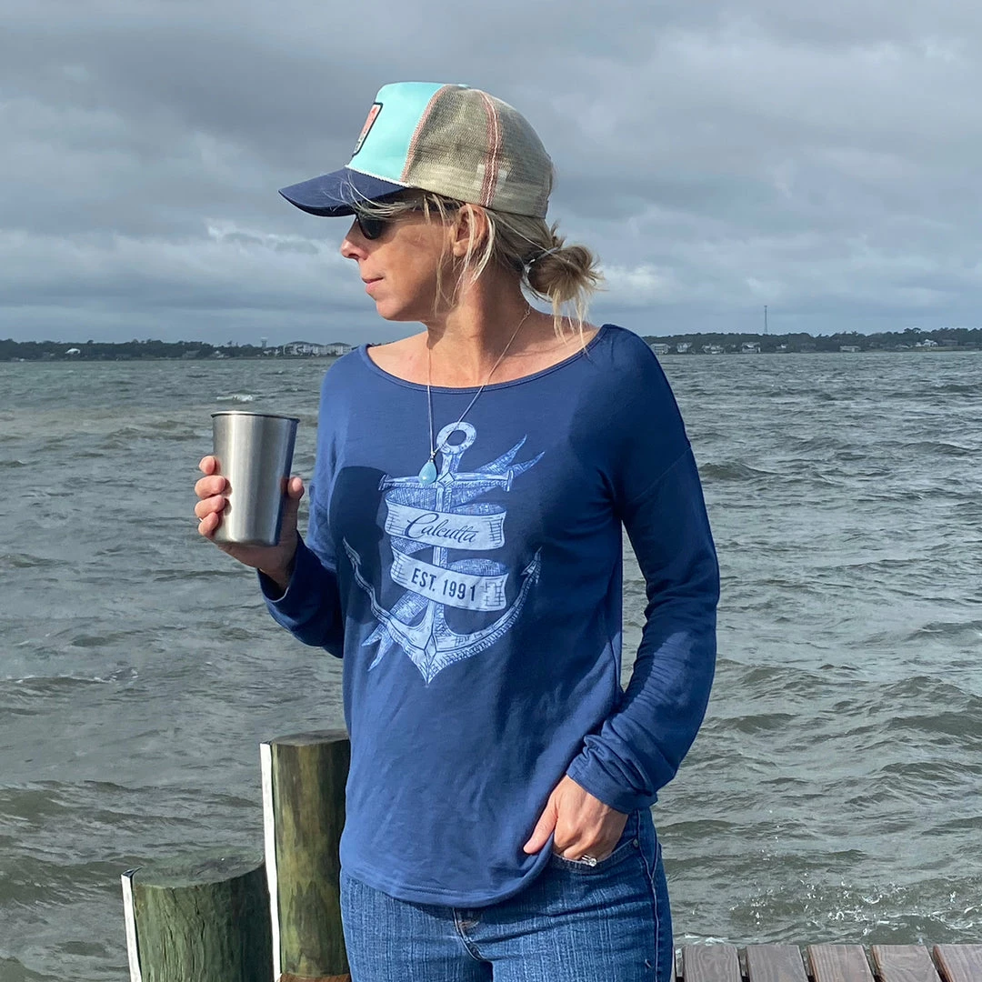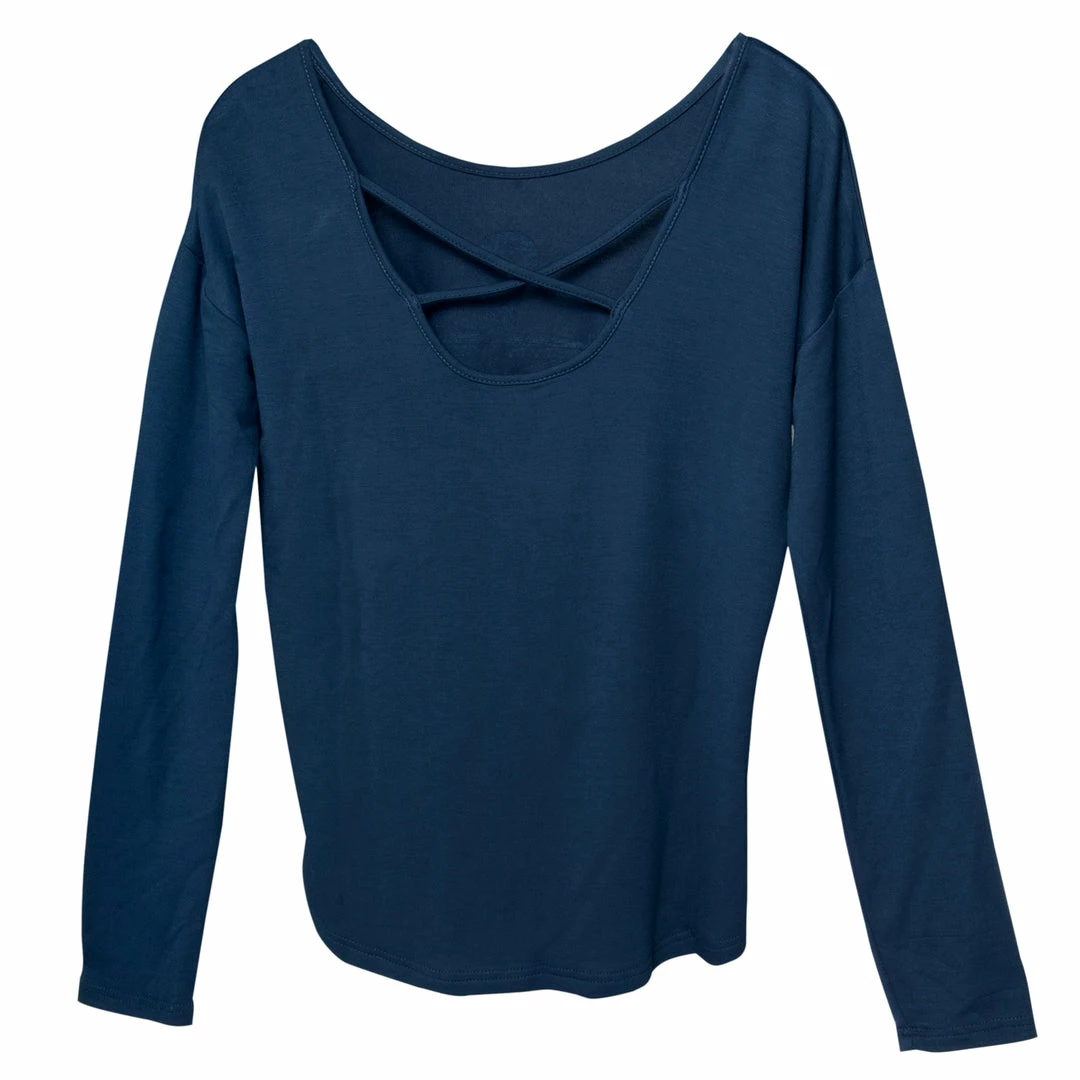 This women’s long sleeve tee features a drop shoulder, cross back straps, and rounded bottom hemline. Comfortable french terry blend fabric of rayon, polyester and spandex. Tone on tone graphic shows you are anchored in style.