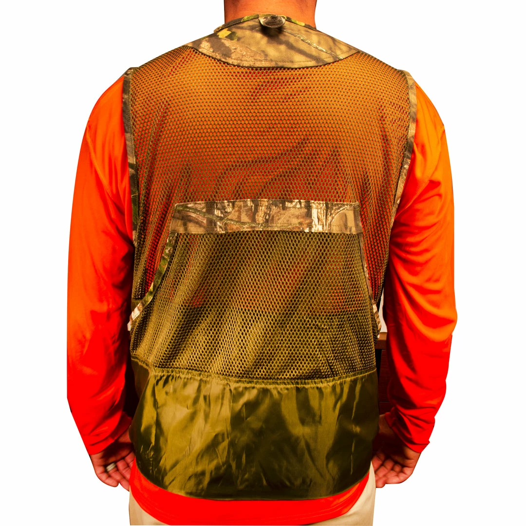 Mesh and canvas material to maximize durability and breathability. Lined game-bag on back. Dual front pockets with shell loops. Mossy Oak® Break-up Country camouflage pattern.
