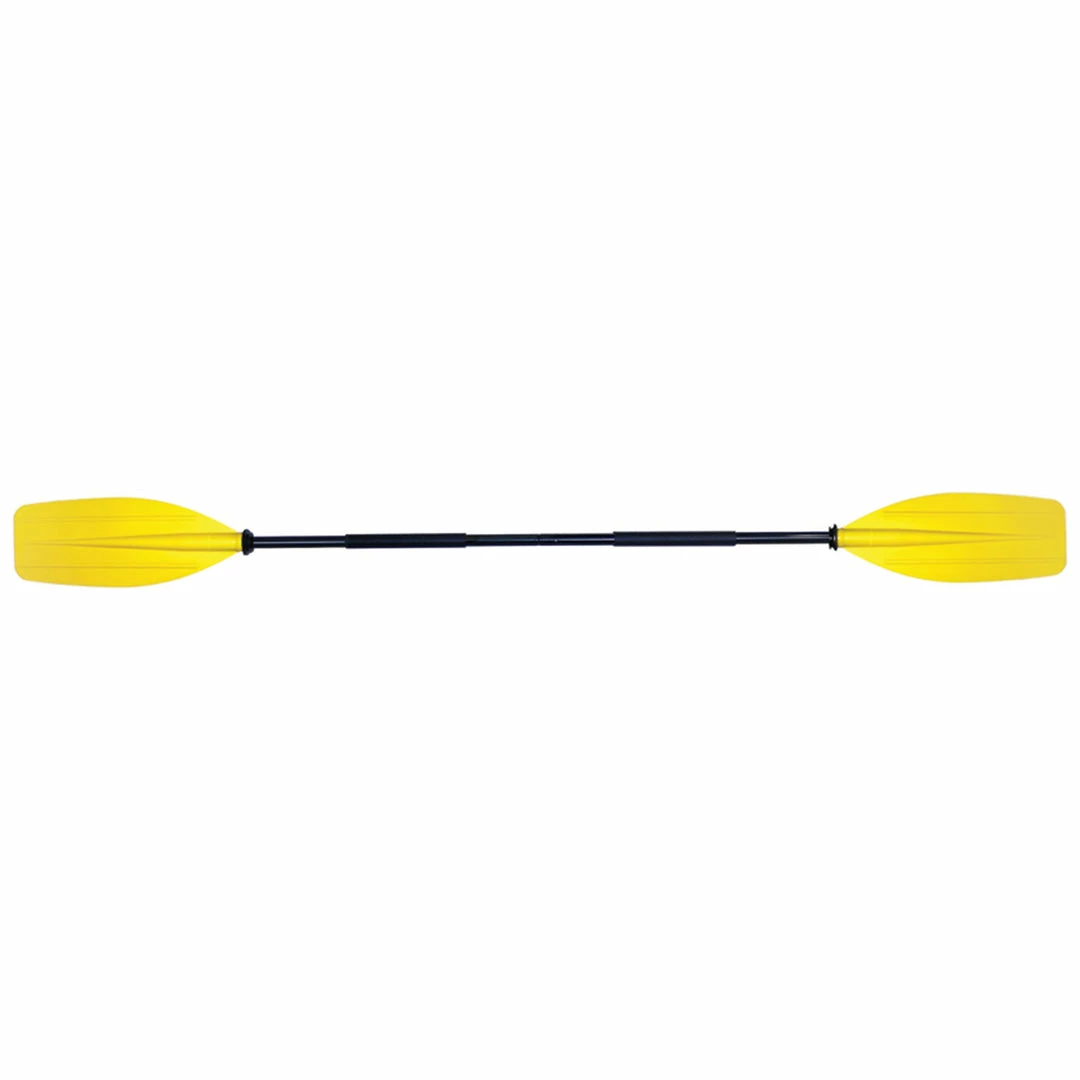 84″ straight blade, 2-piece kayak paddle with aluminum shaft and ABS blades. The lightweight design features foam grips and drip guards for comfort.