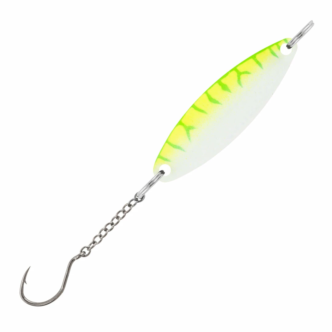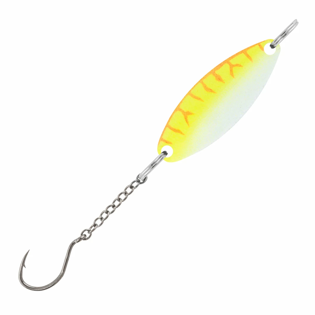The Boji blade is available in 3 sizes 1/16th, 1/6th and 3/16th ounces. Finished with UV tape and glow paint accents – these blades remain highly visible in deeper water and their large profile provides a large target for aggressive mid-summer panfish. The chained hook will stand up to the teeth of a larger predator and gives you a real shot to land that surprise monster.