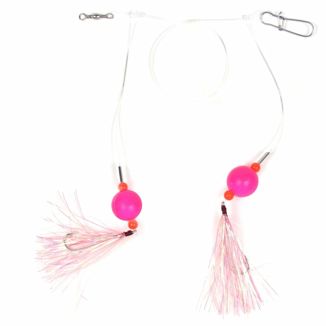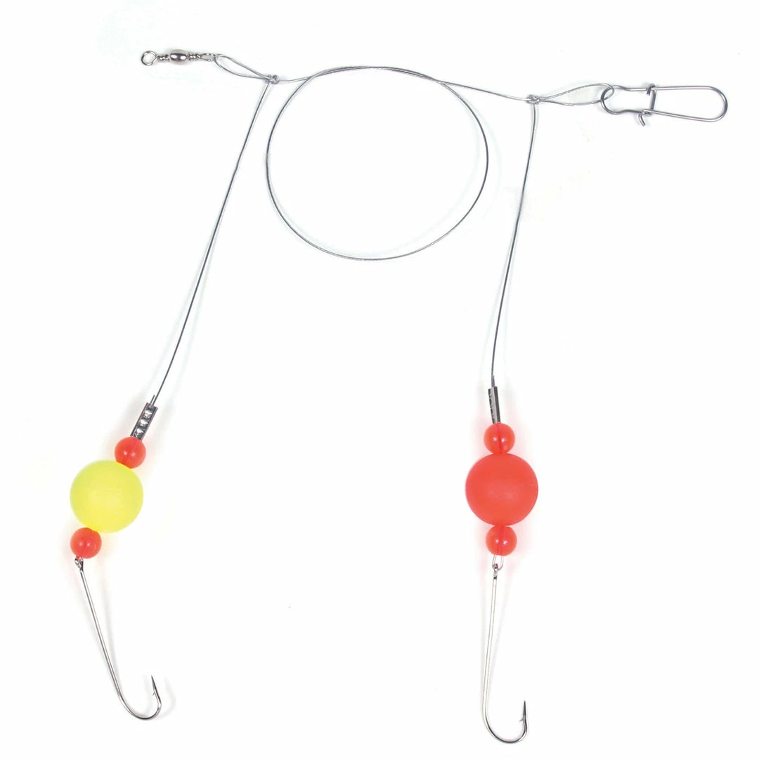 Our most popular Bluefish rig. This double drop rig is tied on 40 lb mono or 60 lb nylon coated wire. The 3/4″ float model has #4 plated hooks and the 1″ float model has 3/0 plated hooks. Both have a #5 swivel at the top and a #5 snap for sinker attachment.