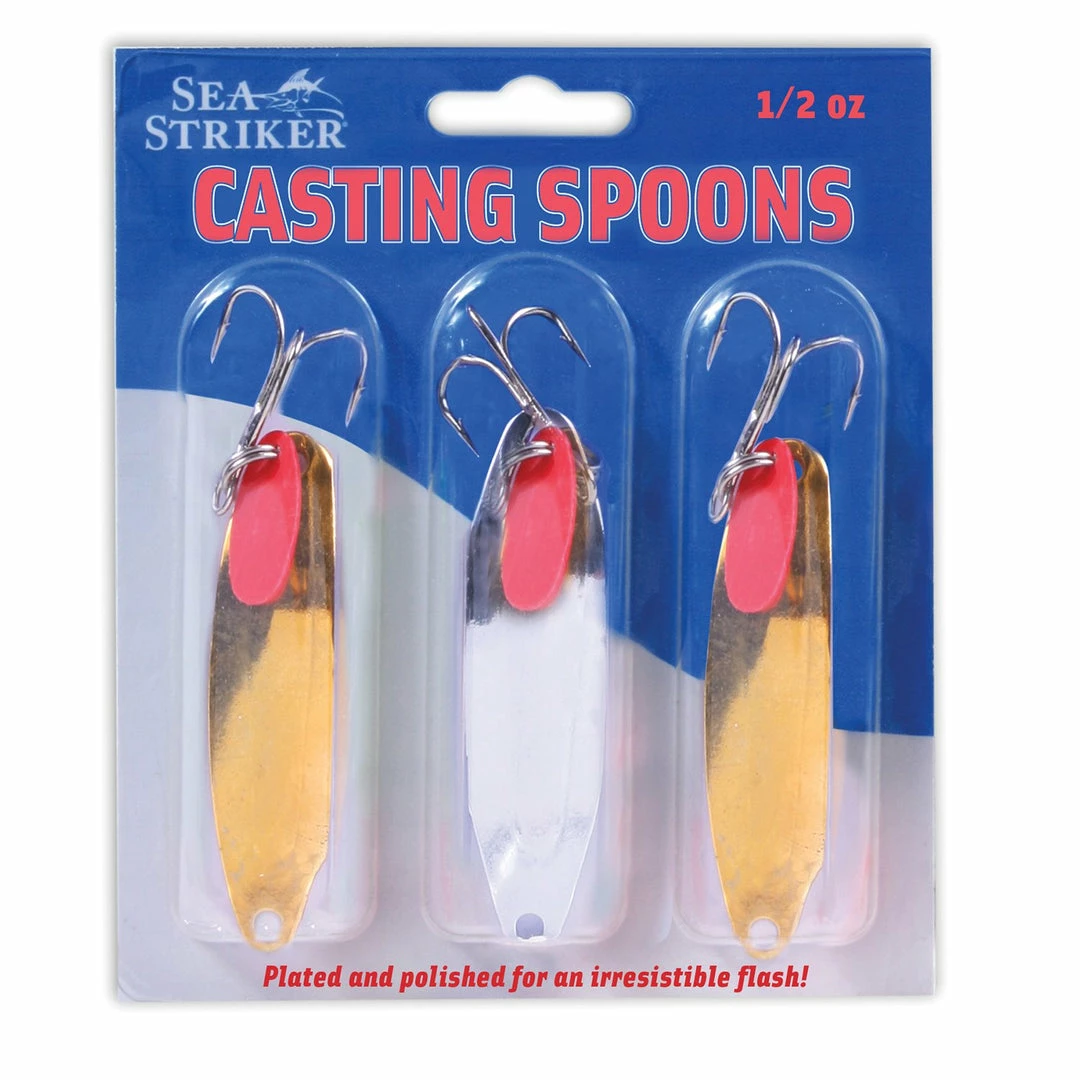 Gold and silver plated and polished casting spoons. Hooks are plated for saltwater use. All spoons have a red lure flipper on the hook ring. Available in 1/4 oz or 1/2 oz packs.