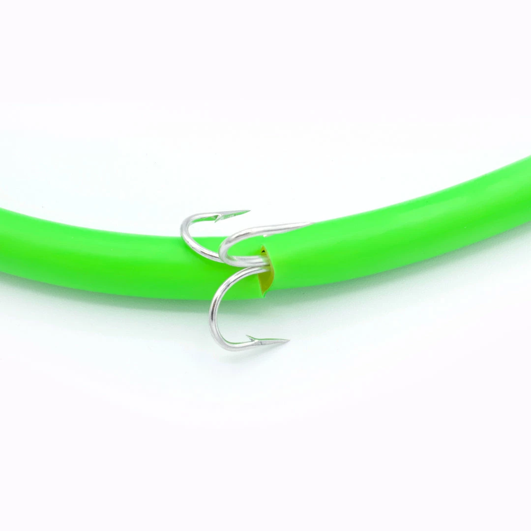 A 14” tube with two 2/0 heavy saltwater treble hooks. Rigged with two 1/4 ounce egg