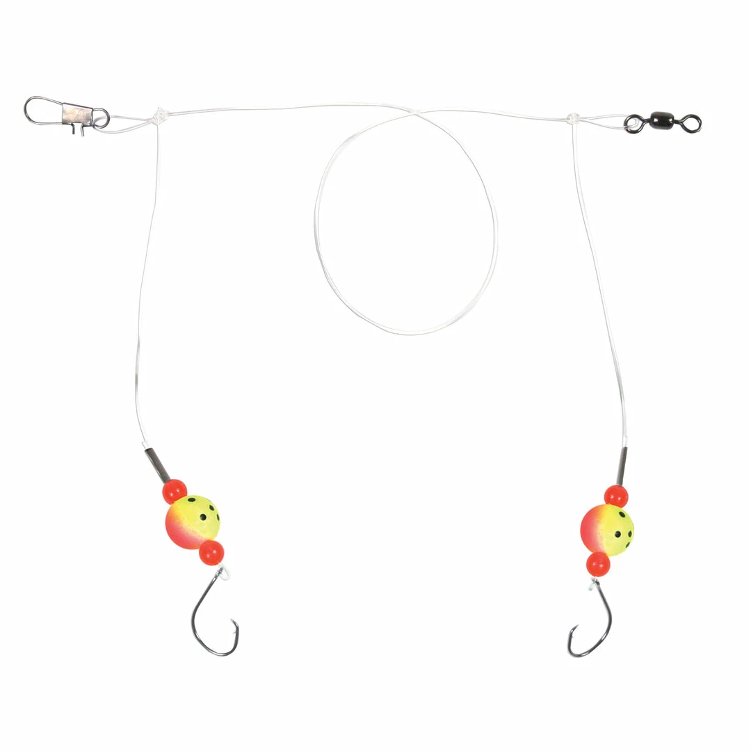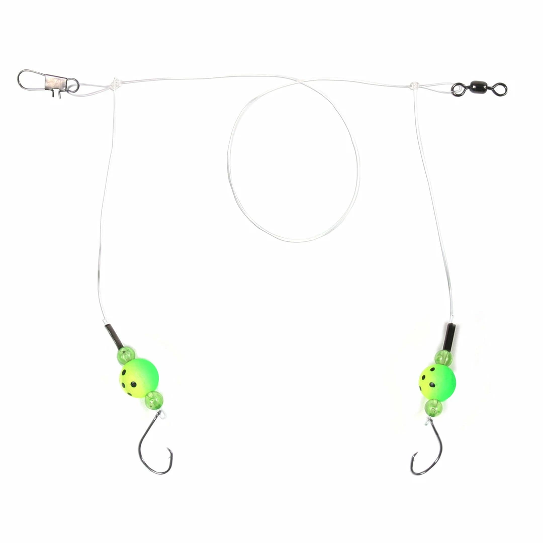 Double drop rig tied with fluorocarbon and size 2 circle hooks. This double drop rig is perfect for spots, kingfish, and other small to medium size fish. The 1/2″ ball floats keep the bait off the bottom and away from crabs.