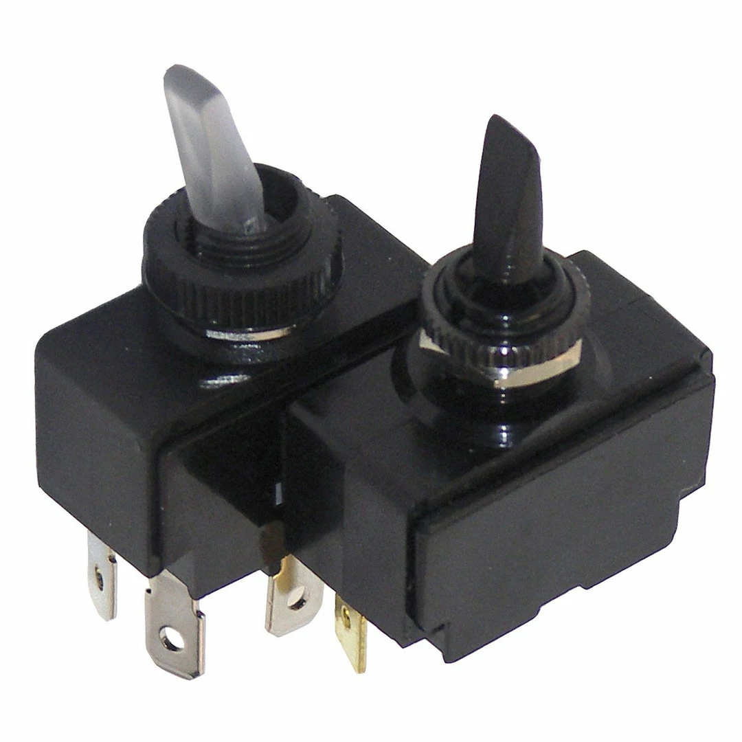 On/Off toggle fits panels up to 1/4″ thick, comes with spade type terminals, great for lights, aerators and blowers. 15 Amp @ 12V.