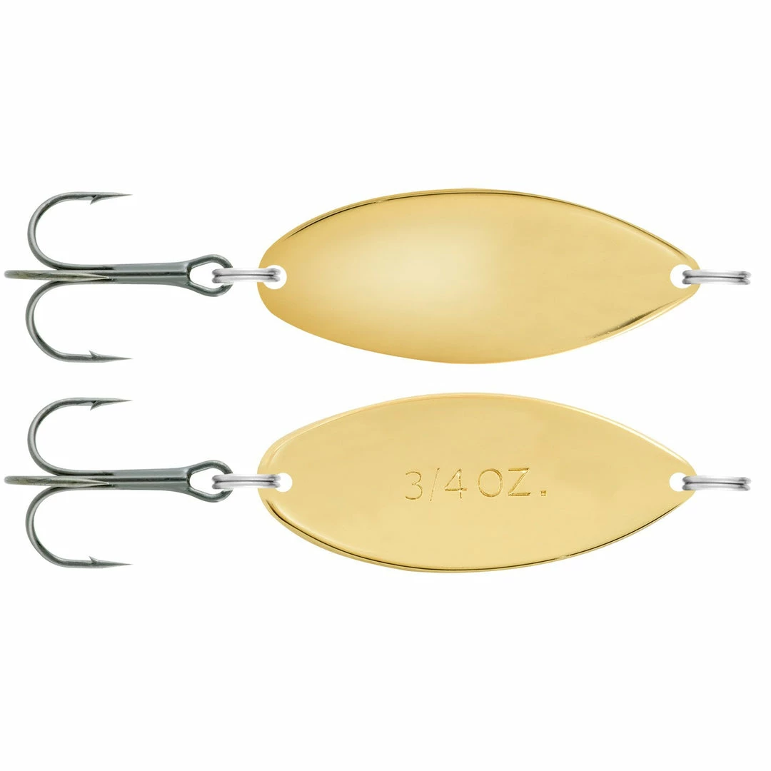 Wide wobbling action and flash, spoon body is 100% brass to cast far and run deep.