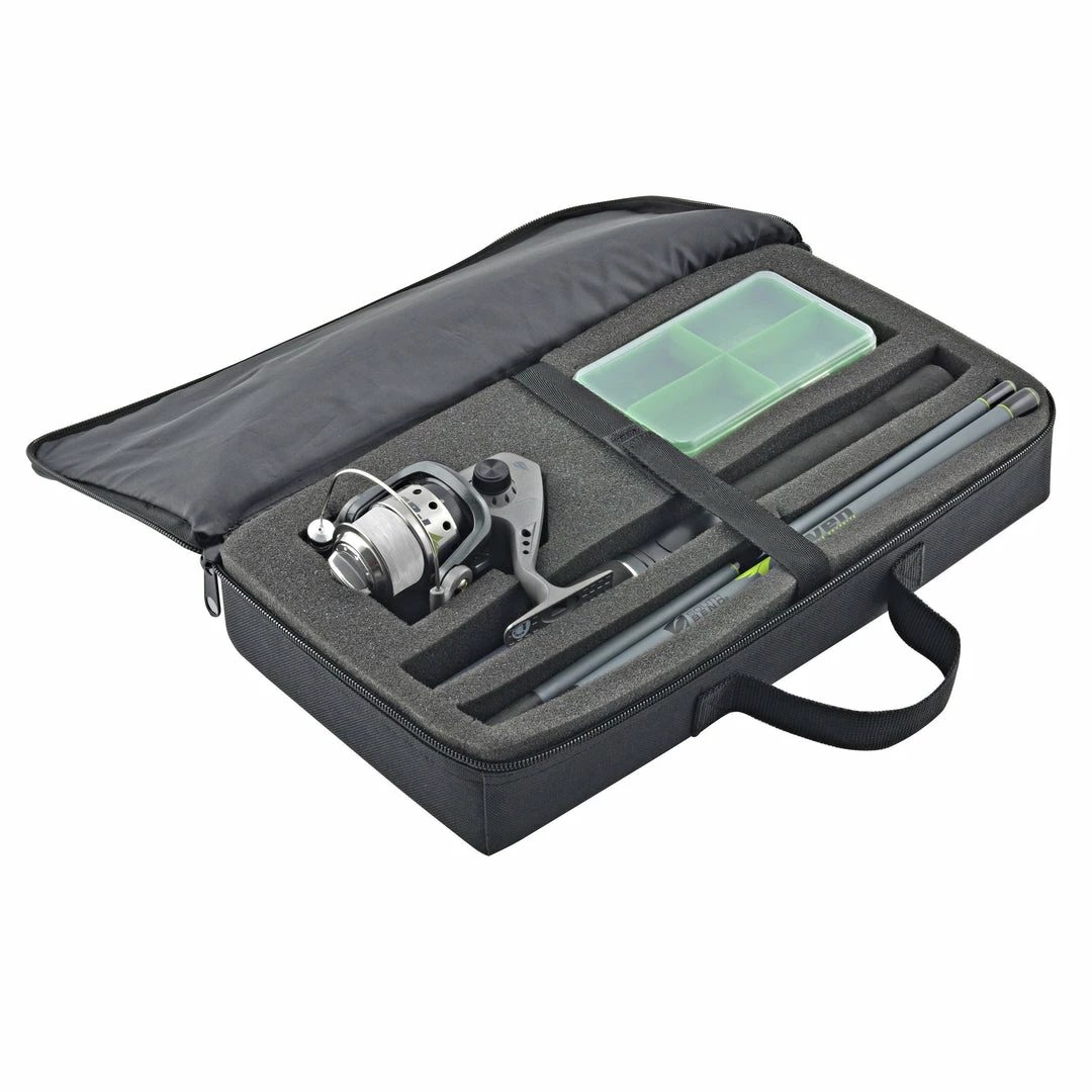 The Raven split-grip 6 piece Travel Pack Combo comes with a pre-spooled, 6′ spinning combo nestled into a convenient and durable foam lined denier nylon carry case that travels anywhere.